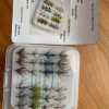 Scientific Anglers Amplitude WF-5-F smooth fresh water floating fly line with four tapered leaders, donated by Pat Gillies, plus a fly reel, 24 flies (from Rod Bailey) and two spools of mono