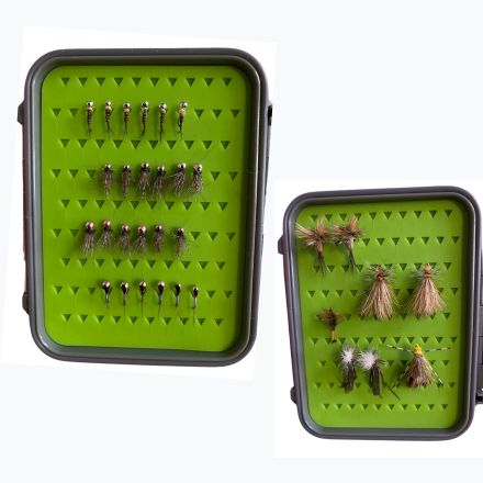 #30 26 assorted stillwater flies in a double-sided water tight box, donated and tied by Richard "Kossie" Koss