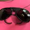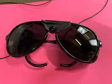 Mako polarized sunglasses with hooked earpieces. Black lenses. Leather nose and side pieces to stop glare. In soft case.