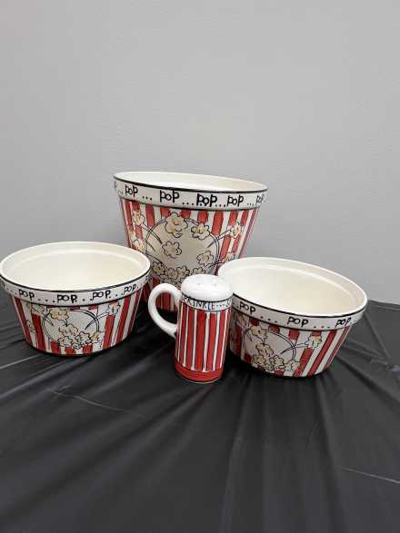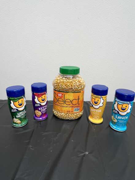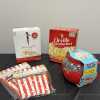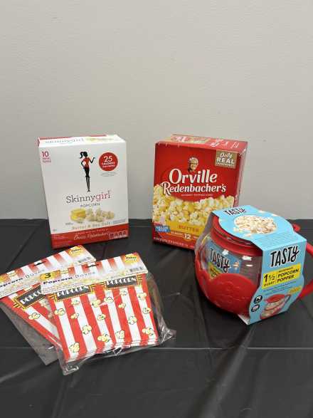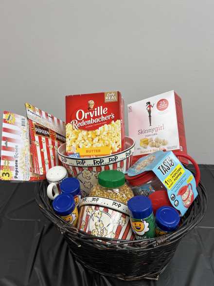 Popcorn is a great snack when the weather cools. Enjoy microwavable Orville Redenbacher's butter popcorn, Skinny Girl butter and sea salt microwavable popcorn or use the Jolly Select kernel corn in the Tasty 1 1/2 quart microwave popcorn popper. Serve it up in the large ceramic red and white striped large bowl with two smaller bowls, salt shaker and 6 popcorn boxes. Top with butter, kettle corn, garlic parmesan or ranch seasoning, all contained in a large black wicker basket.