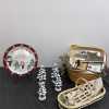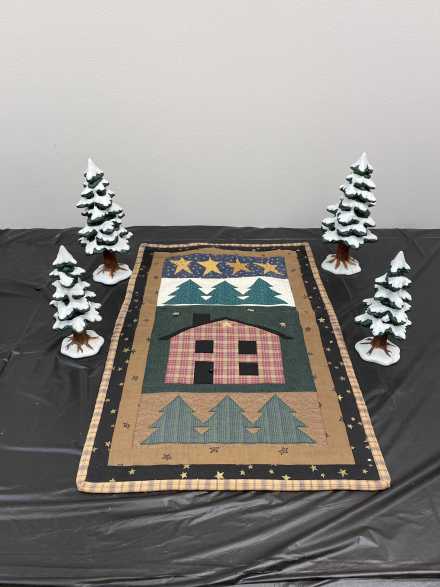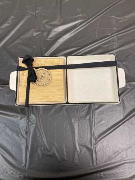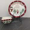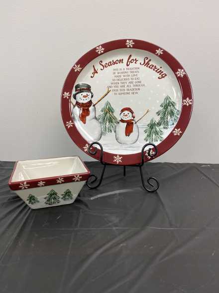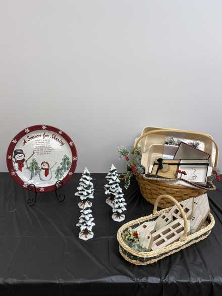Bake your traditional holiday goodies and treat family and friends to a time of sharing using this 13-inch round St. Nicholas Square Yuletide "A Season for Sharing" platter and matching serving bowl. Also includes Demdaco Made to Share 2-in-1tray/cutting board, 3 qt. and 5 qt. Brandani Stoneware baking dishes, Auld Home Design set of 7 wooden house silhouettes, and two 7-inch and two 9-inch Lemax Village Dickensvale porcelain pine trees, all in large wicker basket with handle.