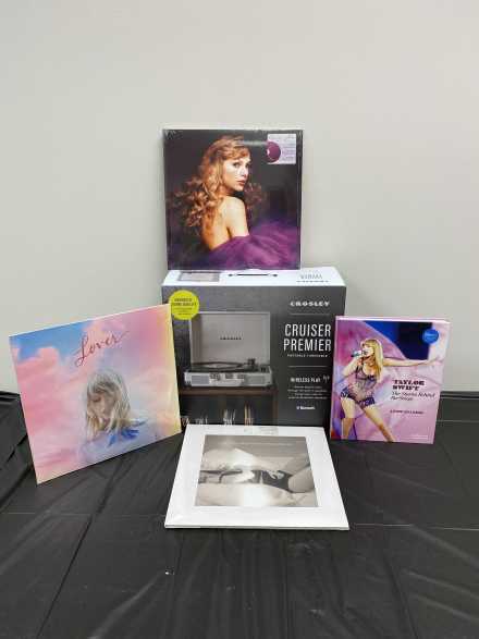 Also includes Crosley Cruiser Premier portable vinyl record turntable, with speakers and wireless Bluetooth, and "Taylor Swift - The Stories Behind the Songs" chronicle of her songs and their meanings.