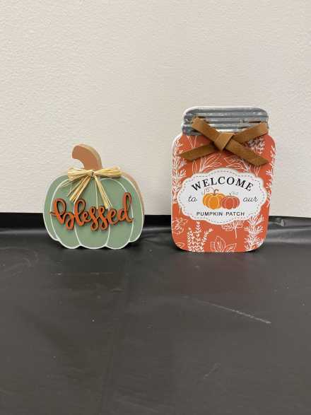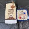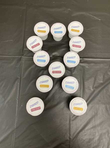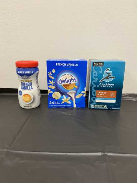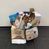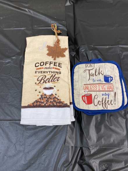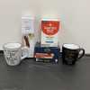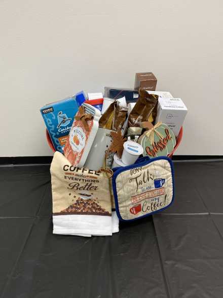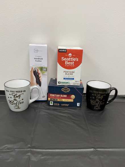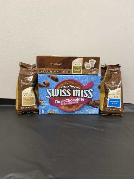 Take your pick from a variety of coffees, including Keurig Caribou Blend, Private Selection Venetian Blend, Seattle's Best Medium Roast, Harry & David Vanilla Creme Brulee, Northwest Blend and Breakfast Blend, Mainstay cordless handheld frother, two "All You Need is Love and Coffee" ceramic mugs, mini "Blessed" pumpkin wooden sign, "Welcome to Our Pumpkin Patch" wooden sign, Swiss Miss Dark Chocolate, coffee creamer, kitchen towel, and oven mitt, all in a large plastic tote.