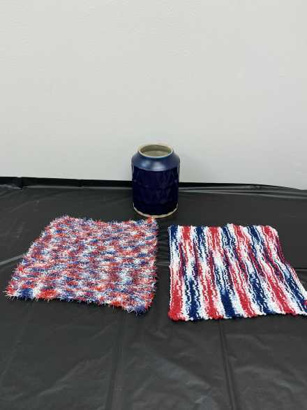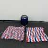 Pat's hand-quilted red, white and blue "America" table runner will look beautiful on your table. Also includes two red, white and blue handmade dish cloths by Brenda, a Scentworx Scarlet Leaves candle, and navy blue ceramic vase, all in Longaberger basket with liner.