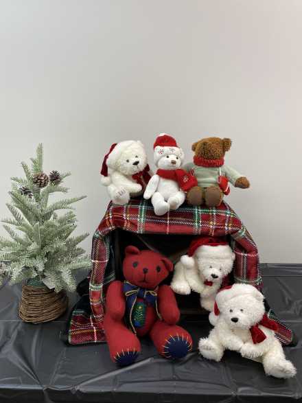 Plush bears galore adorn this four-section wooden box, surrounded by a gorgeous plaid 50 X 60 inch holiday throw and 22-inch evergreen tree, perfect for setting the Christmas mood.