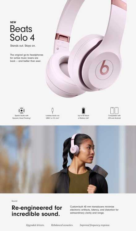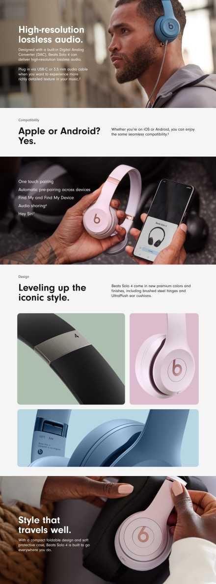 The original go-to headphones for active music lovers are better than ever. It's a Beats Solo 4 wireless Apple headphones in slate blue. Ultralight ergonomic design for all-day comfort. Delivers high-resolution lossless audio. Up to 50 hours of battery power.