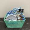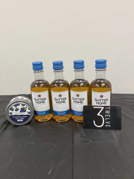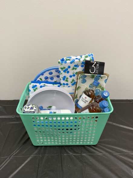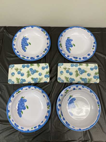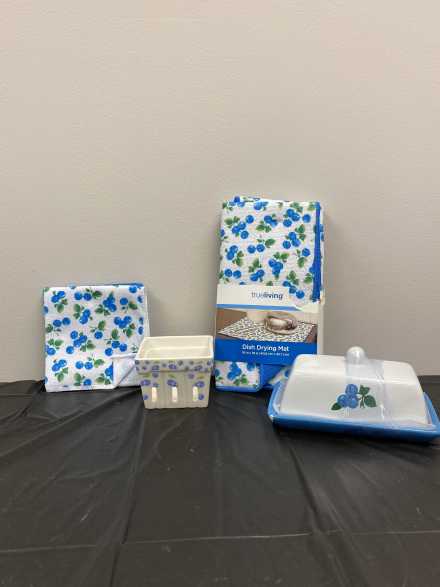 You'll have a blueberry blissful day with this set of four dinner plates, four bowls, butter dish, two mini platters, small serving container, butter dish, blueberry-scented candle, dish drying mat, and two dish cloths. Also includes $25 gift card to 3Twelve Burger Bar and four Sutter Home Riesling minis, all in a green tote.