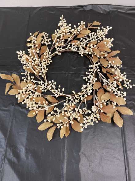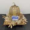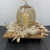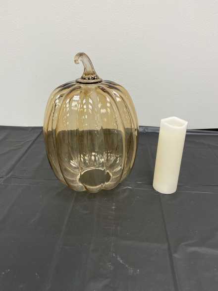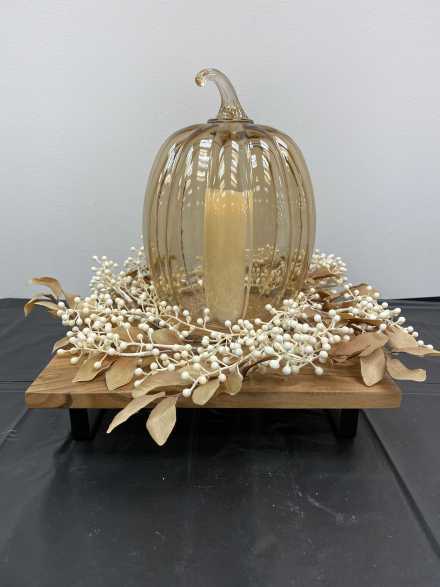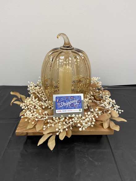 Light up your fall table with this beautiful decorative 11-inch tall glass pumpkin featuring a white, battery-operated pillar candle. It's surrounded by dainty white berries and fall foliage, situated on a 12-inch square wooden tray with metal legs. Also includes a $50 gift card good for TJ Max, Marshalls, HomeGoods, Sierra and Homesense stores.