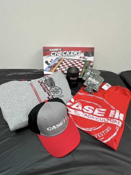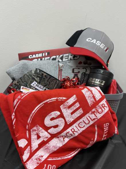 Challenge your friends to a game of checkers with this Case IH collectible checkers set! Also includes black Yeti Birkey's koozie, size XL red Case IH hat, size M gray Case IH zippered hoodie, Case IH cap, and two koozies, all in gray basket.