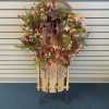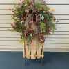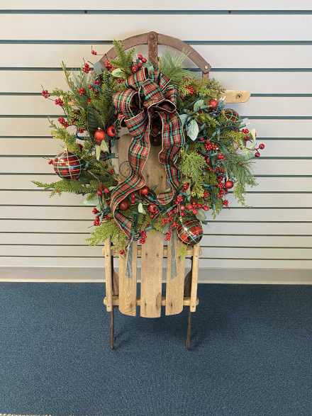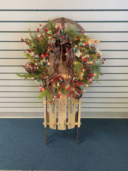 This 4-foot antique wooden sled must have carried lots of screaming children down snowy hills. It is now transformed into a front door showstopper, complete with 20-inch lit wreath featuring fthree plaid ornaments, faux evergreens, red berries and lots of green, red and black plaid ribbon.