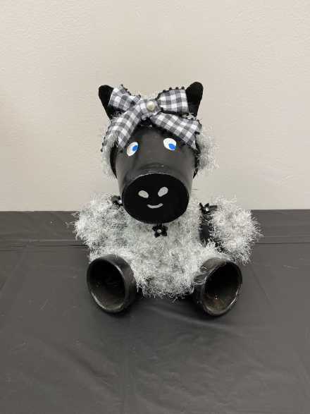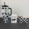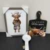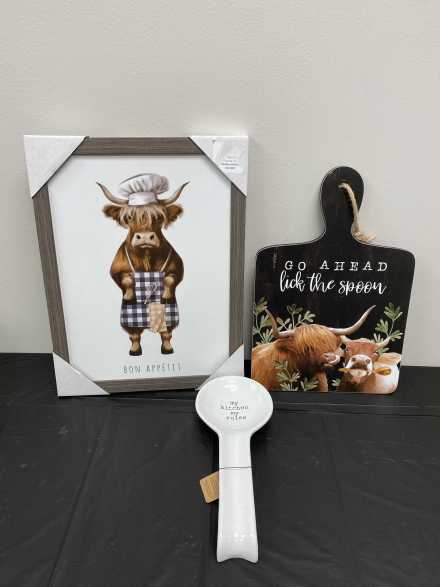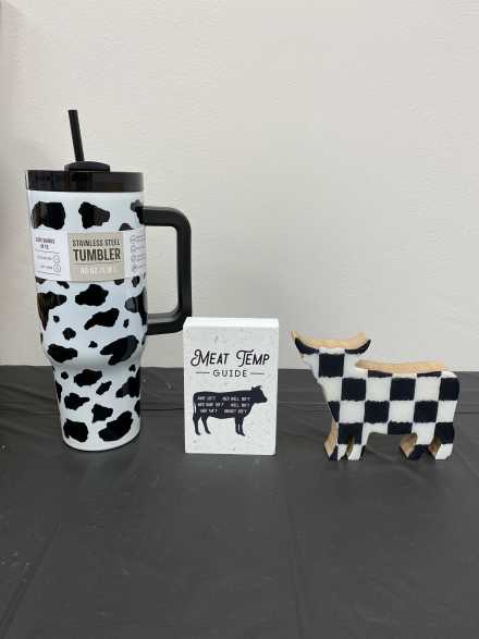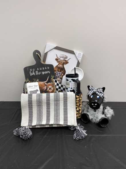 Cowabunga! Lots of cute cow collectibles ranging from 16 X 12-inch cow artwork to 10-inch tall black and white flowerpot cow, "Go Ahead Lick the Spoon" wooden paddle, 40 oz. spotted stainless steel tumbler, "My Kitchen My Rules" spoon holder, mini black and white checked cow, and Meat Temp Guide wooden sign, all in gorgeous wicker basket.
