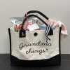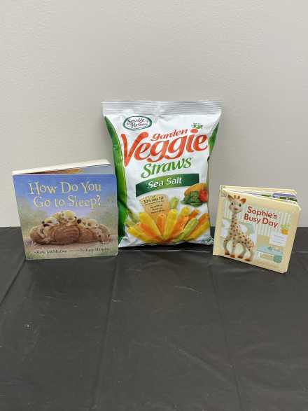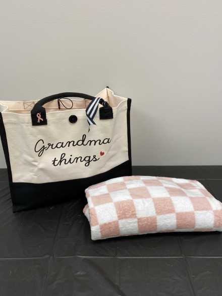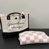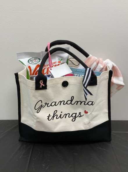 Your lap is a good spot for your grandchild to cozy up for a bedtime reading session! Grab this soft pink and white checked throw and begin. Includes books titled "How Do You Go to Sleep?", "Where is Baby?", and "Sophie's Busy Day". Plus, kitty cat journal, notebook, coloring book, 12-pack Crayola colored pencils, Garden Veggie Straws, and L.O.L. Surprise! magic ink pictures/stickers, all in a black and cream canvas tote titled "Grandma things".