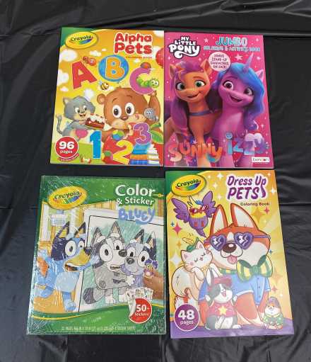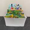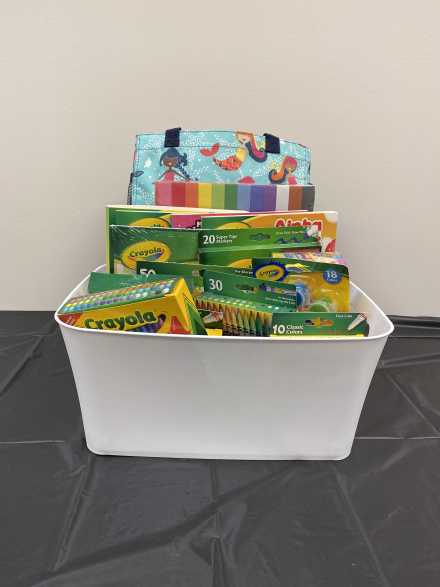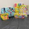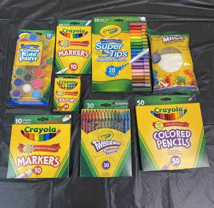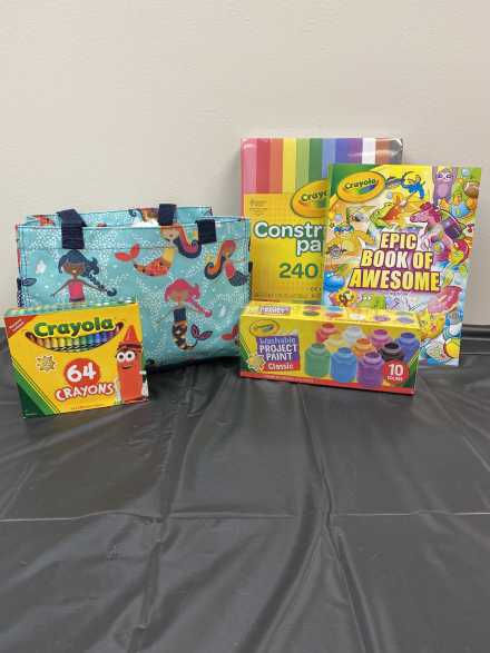 The little ones in your life will love trying all these Crayola products, including 10-count fine line and broad line Classic Colors markers, 24-count and 64-count crayons, 30-count Twistables colored pencils, 18-count Washable Kids Paint, 10-count Washable Project Paint, Model Magic, 50-count pre-sharpened Colored Pencils, 20-count Super Tips Washable Markers, Bluey Color & Sticker book, Alpha Pets, Dress Up Pets, Epic Book of Awesome and My Little Pony coloring books, 240-count construction paper, and small mermaid-themed Thirty-one tote bag, all in white plastic tote.
