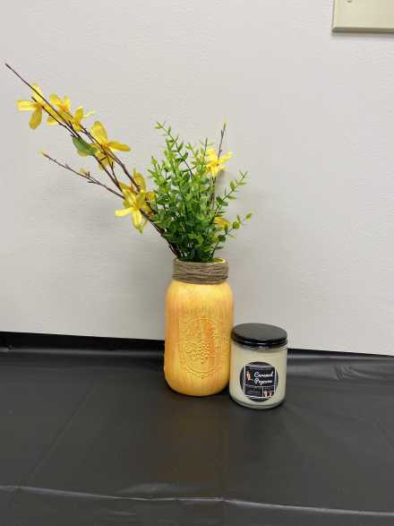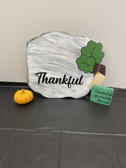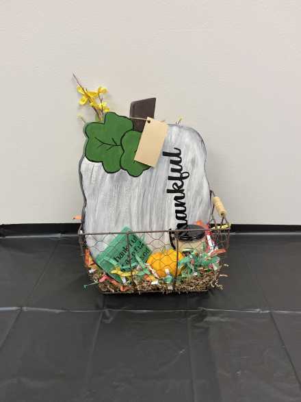 Highlight your fall decorating with this "Thankful" wooden pumpkin wall hanging, handmade by Samantha of Booner Crafts. Also includes festive painted mason jar with faux foliage and flowers, "Thankful, Grateful, Blessed" wooden sign, Black Cat Candle Company Caramel Popcorn candle, and mini pumpkin, all in wire mesh basket.