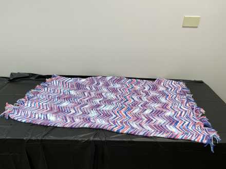 Give it as a gift or keep for yourself! This 4 X 2.5 foot pink, white, powder blue and cornflower blue crocheted afghan was hand-made by Brenda.