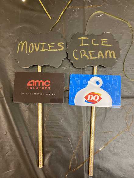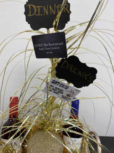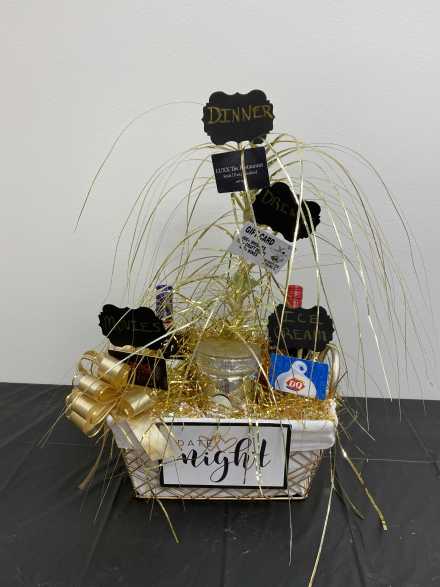 For that special night out with your favorite date! Includes Oliver Winery Sweet Red and St. James Winery Blackberry, $100 Luxx gift card, $50 AMC Theatres gift card, $30 The Rusty Fox gift card, $20 Dairy Queen gift card, and No. 35 Amber Woods candle, all in lined gold wire basket.