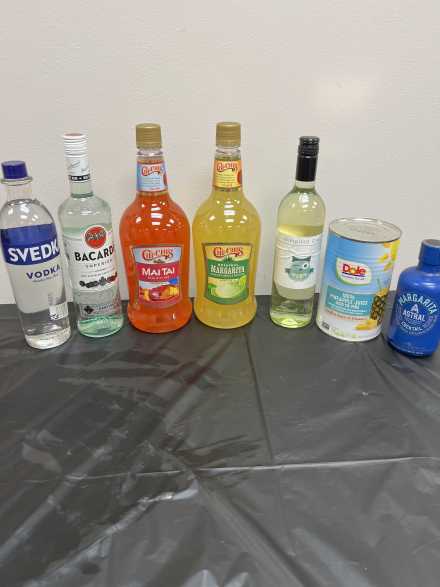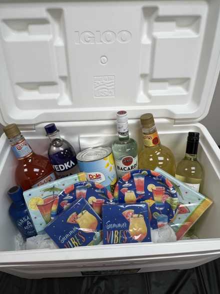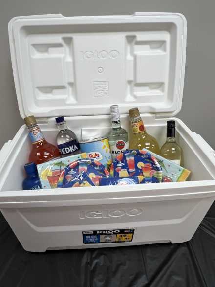 A few ingredients to get the party started! Just grab the ice and enjoy! Includes Moscato wine, 750 ml Bacardi Rum, 750 ml Svedka Vodka, Chi Chi's Mai Tai mix with rum and Lime Margarita mix with tequila 1.75 L, Margarita Astral Cocktail 375 ml, pineapple juice, small paper plates and drink napkins, and large drink napkins, all contained in an Igloo 48 qt. cooler.