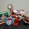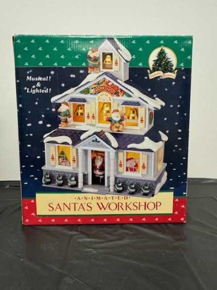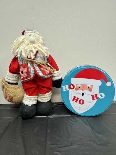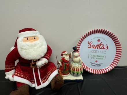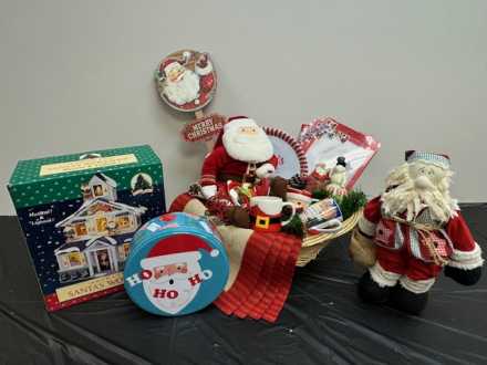 If you love Santa, this is the basket for you! Includes vintage 18-inch Hallmark Polar Express plush talking Santa who says "Remember, the magic of Christmas lies in your heart", weighted 16-inch stuffed Santa, vintage Holiday Classics animated, musical and lighted Santa's Workshop, Jim Shore Heartwood Creek "Share the Spirit" figurine showing Santa building a snowman, Santa serving dish with mini knife, "Santa's Workshop" platter, Santa ornament, "Ho, Ho, Ho" cookie tin, five sets of Santa stationery, "Merry Christmas" Santa yard sign, and four holiday placemats and mugs, all in a large wicker basket.