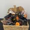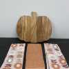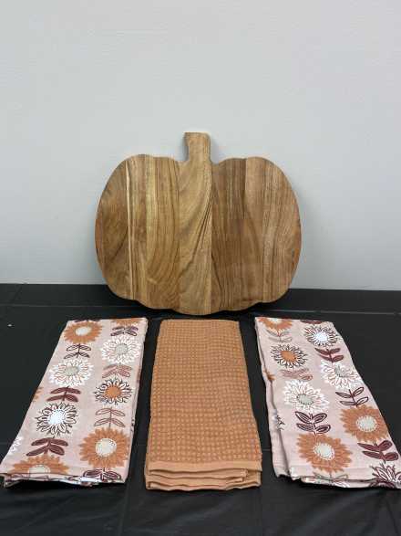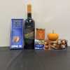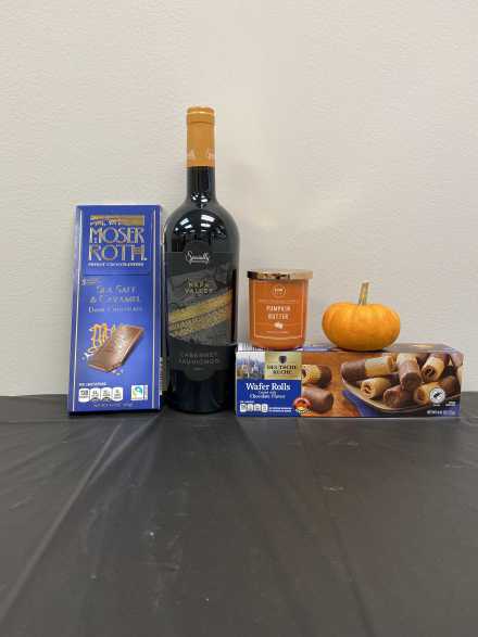 Prepare a great fall spread of delicious appetizers, starting with this 17 X 15 inch pumpkin-shaped charcuterie board. Also includes three fall dish towels, napkins and plates, Napa Valley Cabernet Sauvignon, sea salt crackers, cheese crisps, rosemary crackers, glazed pecans in garlic and herb nut blend, sea salt cashews covered in milk and dark chocolate, charcuterie trio of salame and piccante salami, wafer rolls with chocolate, white cheddar cheese olives, Kalamata olives, sweet jalapeno chili jam, variety of fruit spreads, all natural apple butter, pumpkin candle, and mini pumpkin, all gathered in a large wicker basket.