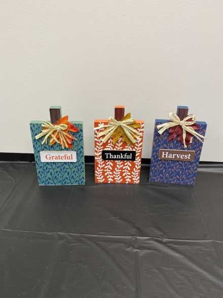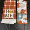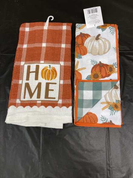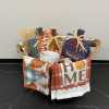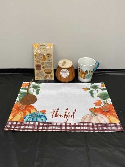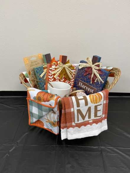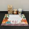 Burn your orange cinnamon-scented candle and get in the mood for fall. Also includes three wooden "Harvest", "Thankful", and "Grateful" tabletop signs, placemat, two kitchen towels, mug, stickers, and leather pumpkin tag, all in wicker basket.