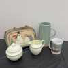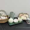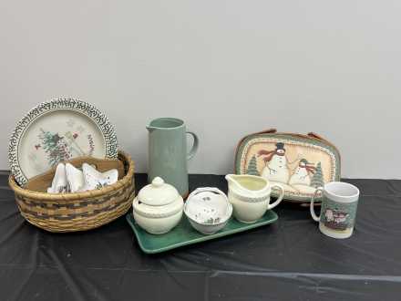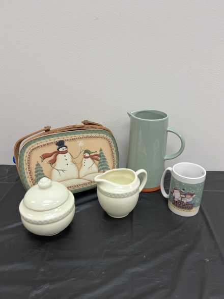 Set your table for a special get-together with friends with your four "We Can Build a Snowman" dinner plates, Nikko Christmastime candy basket, two Christmas tree-shaped candy dishes and star-shaped candy dish, 8-inch sage green pitcher, cream and sugar dishes, dark green ceramic tray, holiday mug, and small basket featuring two snowmen, along with a woven basket with divider.