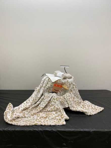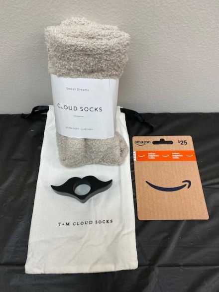 Your perfect collection of necessities for a cozy night in - just add books! Includes a warm cream-colored 5.5 X 4.25-inch blanket, Gritin LED book light, Sweet Dreams Cloud Socks with canvas bag, glass cup with straws/cleaner, mustache-shaped page holder, and a $25 Amazon gift card for books of your own choosing, all in rope basket.