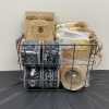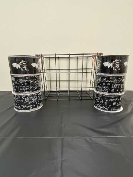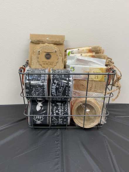 For those who usually have lots of craft projects in the works! Includes two rolls of black and white Celebrate It 2.5 inch X 25 feet of ribbon stamped with Joy and deer head, four rolls of Celebrate It black and white 2.5 inch X 25 feet of ribbon stamped with Merry Christmas, Jingle All the Way, Joy, Peace and Happy Holidays, Craft Smith 10-piece burlap banner, RGI Home chalkboard burlap tags, Creative Essentials 2 inch X 3 yards of burlap ribbon, four sets of Creative Essentials adhesive die-cut burlap letters, and eight Creative Essentials 6.25 inch X 10 inch cinch burlap bags, all in wire basket with handles.