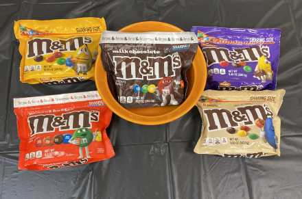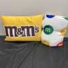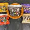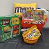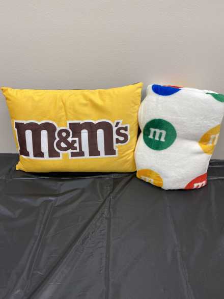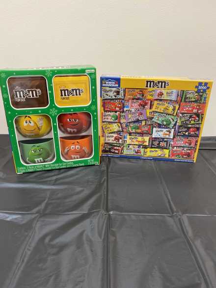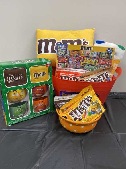 For the M&M fanatic! Includes White Mountain 1,000-piece M&M puzzle, M&M pillow and blanket, 4-piece M&M ceramic bowl set with 2-packs each of fun size milk chocolate and peanut M&Ms, and five 10.05 oz. packs of peanut, milk chocolate, dark chocolate peanut, peanut butter and almond candies, all in a red container.