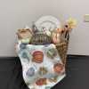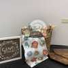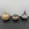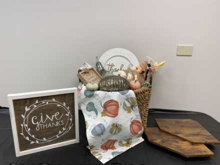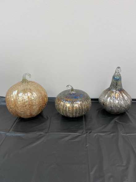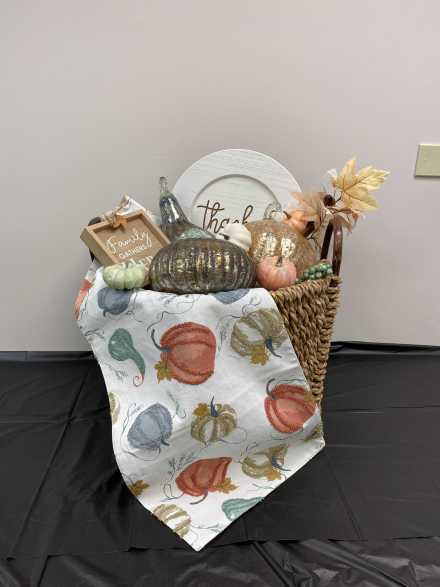 You'll love this trio of three gorgeous glass pumpkins, 7.5 inches, 9.5 inches and 6.8 inches tall, beautiful fall table runner, two wooden signs with the themes "Give Thanks" (with "Merry and Bright" on the flipside) and "Family Gathers Here", two wooden corner wall shelves, "Thankful" platter, along with mini pumpkins, all showcased in a large wicker basket.