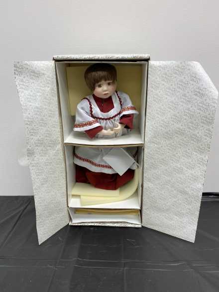 Great gift idea for the first-time altar server. This Franklin Heirloom altar server doll is wearing a white and burgundy surplice over a burgundy cassock. Made with fine bisque porcelain and cloth.