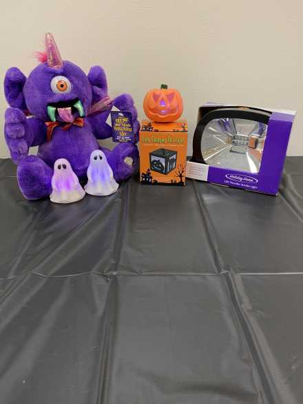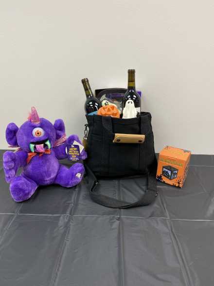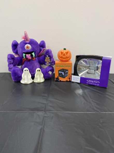 Welcome your Halloween visitors with a song from this purple plush One-Eyed Purple People Eater. Also includes Holiday Home LED Thunder Strobe Light, Color Changing Box Light, battery-operated mini ghosts and pumpkin, Scout & Cellar Dove Hunt Dog Cabernet Sauvignon, and Scout & Cellar Middle Jane Zinfandel, all in four-compartment black tote bag with handles.