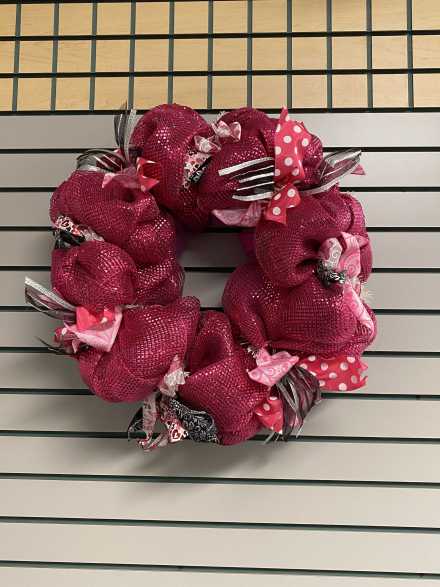 This glitzy pink wreath is a great way to celebrate Breast Cancer Month. Features 20-inch wide wreath of mesh pink ribbon and five different kinds of fun pink, white, black and red ribbon designs with hearts and polka dots. Handmade by Michelle French.