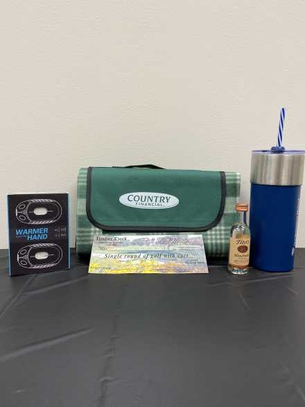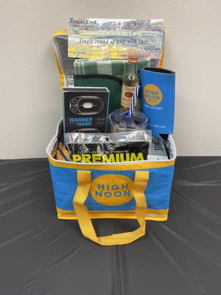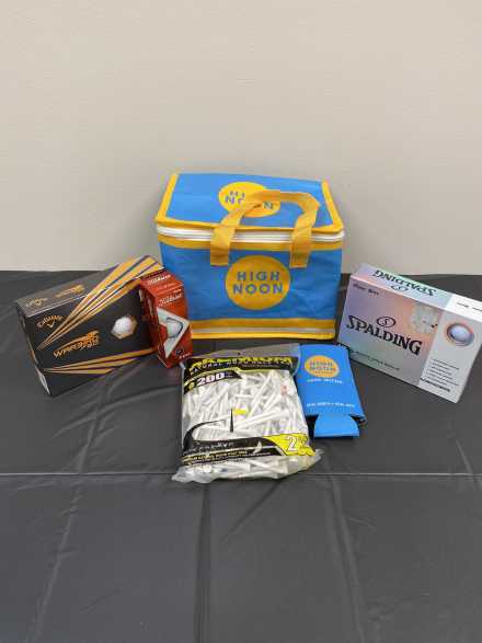 Your High Noon zippered cooler is a must for carrying necessities when you hit the links at Timber Creek Golf course, Dixon. Includes gift card for one round of golf with cart, green and white plaid golf blanket, 12-pack Callaway Warbird 2.0 golf balls, 12-pack Spalding white golf balls, 3-pack Titleist TruFeel golf balls, 25-oz. insulated tumbler with straw, electric hand warmer, 200-count Player Supreme Premium golf tees, mini Tito's Vodka shooter, and koozie, all in the thermal gold and blue cooler.