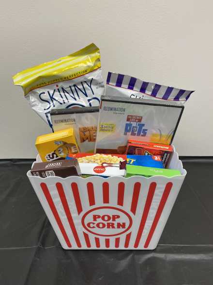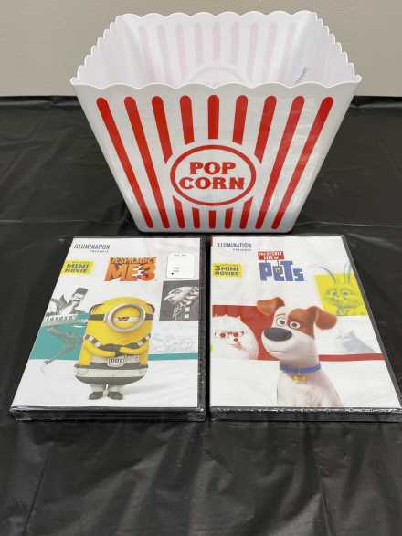 Get ready for your little ones to watch these "The Secret Life of Pets" and "Despicable Me 3" movies over and over again! Includes the two CDs, a $20 AMC gift card, Skinny Pop popcorn and kettle corn, Pop-Secret popcorn, M&Ms, Hot Tamales, and Mike and Ike, all in a large popcorn container.