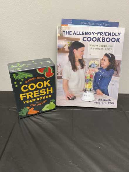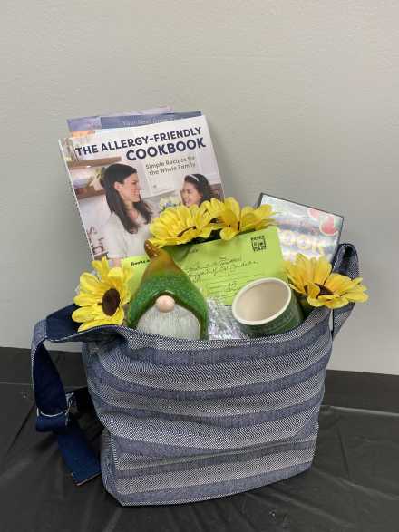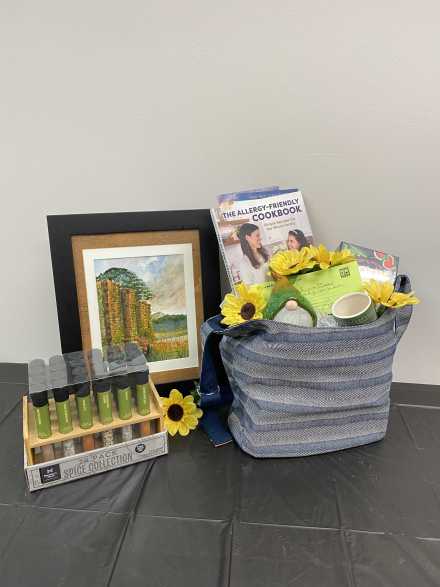 Your "Allergy-Friendly Cookbook" and "Seasons Recipes/Cook Fresh Year Round" will be a welcome addition to your cookbook collection. Also includes $10 Books on First gift certificate, Members Mark 24-pack Spice Collection, framed original watercolor by the late local artist Jan Harvey of a Kilkarney, Ireland ruins, gnome, mini "Plant Kindness" plant holder, plus a blue and white striped Thirty-one tote bag.