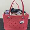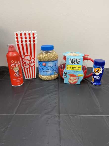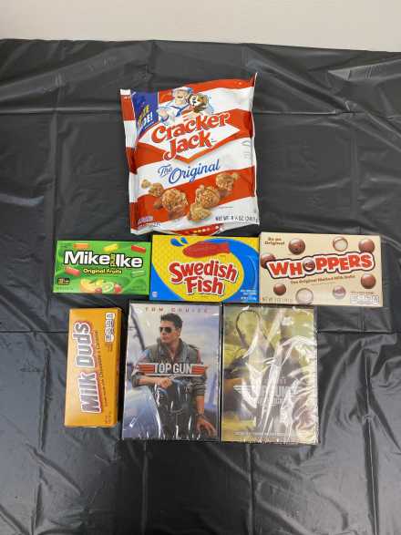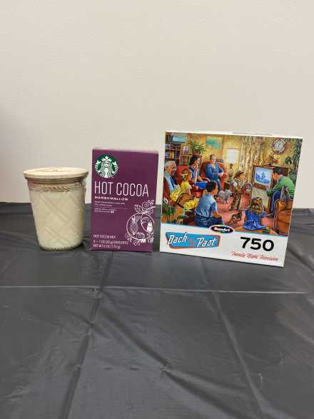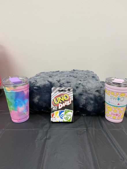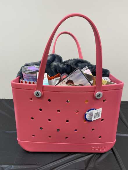 Get cozy with this bright pink Bogg tote full of fun and food for spending a great evening together! Contains soft gray blanket from Urban Farmhouse, Geneseo, Swan Creek Whipped Almond Frosting candle, two 24 oz. Swig Life insulated stainless steel party cups, Top Gun and Top Gun Maverick CDs, Rose Art Back to the Past 750-piece puzzle, Uno Dare card game, Starbucks Hot Cocoa, Tasty microwave popcorn popper, popcorn, butter spray and seasoning, Swedish Fish, Mike & Ike's, Milk Duds, and Whoppers, all in the pink carry-all two-handled tote.