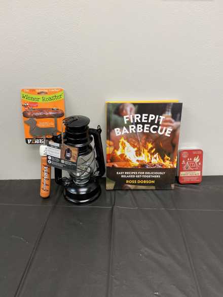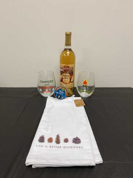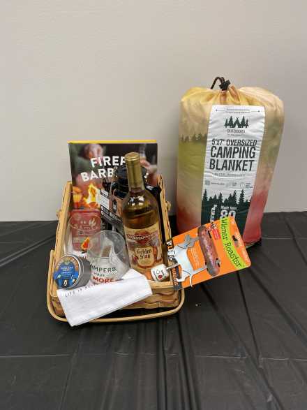 There's nothing better than sitting by the campfire! Relax on your 5 X 7 foot camping blanket and use the Fire Buggz Wiener Roaster for hot dogs or marshmallows. Also includes LED Hurricane Lantern, "Firepit Barbecue" cookbook, Hermannhof Golden Stag white wine, two "Campers Have S'More Fun" wine glasses, "Life is Better Outdoors" hand towel, Mess Hall hand soap sheets, and small emergency first aid kit, all in wicker basket with handles.