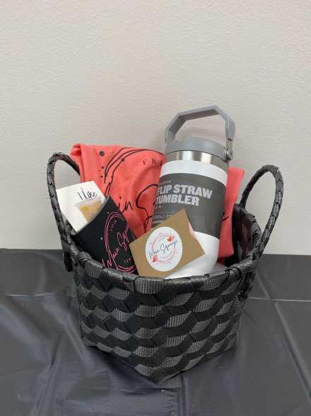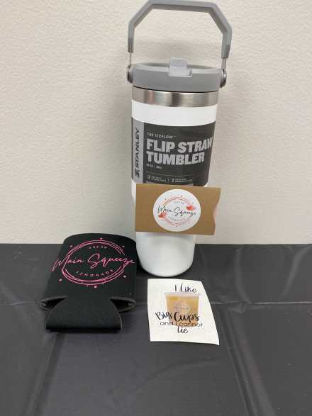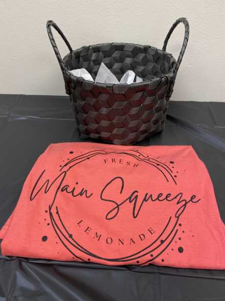Madison Wescott's passion for good old-fashioned lemonade helped her pay for college one lemonade at a time! Now she can be found with her Main Squeeze drink trailers throughout the greater Sauk Valley area, serving up spectacular specialty lemonade concoctions that you'll have to try. Includes a $25 gift card to Main Squeeze, 30 oz. Stanley The Iceflow Flip Straw Tumbler, size L coral t-shirt, and koozie, tucked into a black basket with handles.