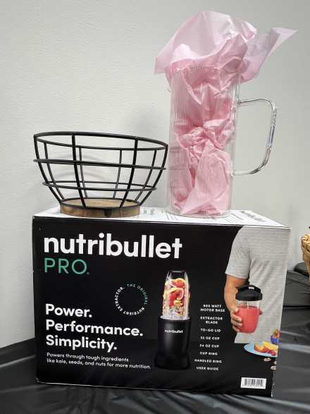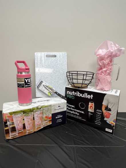 Add fresh fruits and veggies in no time to make a refreshing smoothie using the Nutribullet Pro, Cuisinart paring knife, and 14 X 10 inch cutting board. Also includes glass pitcher, Tommy Bahama 10-piece glass set, wire bowl to hold fruit/veggies, and 26 oz. pink Yeti Rambler.