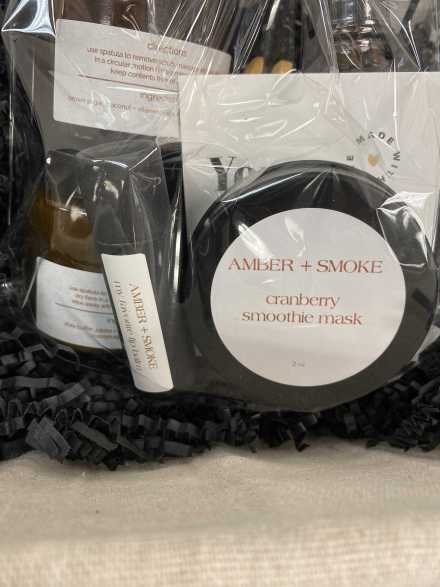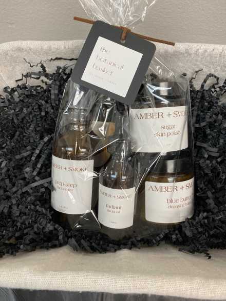 You'll surely feel the love in these all-natural botanical skincare products handcrafted by Sarah. Includes the balanced skin bundle, blue butter cleansing balm, prep-step facial mist, radiant facial oil, sugar skin polish, cranberry smoothie mask, and lip balm, all contained in a lined wicker basket.