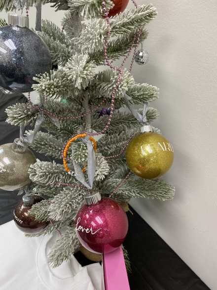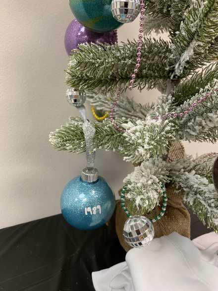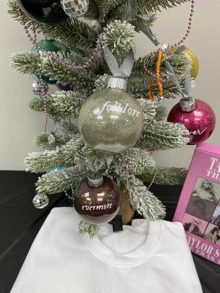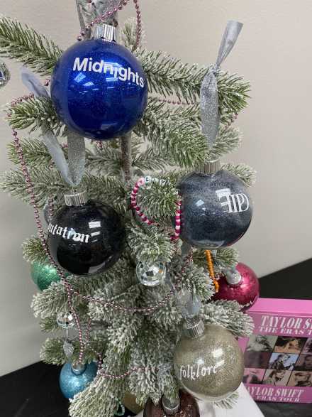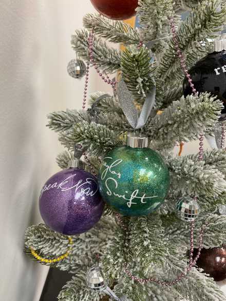 The sparkly, silver mirrorball ornaments were sparked by a song called "Mirrorball" on Taylor's Folklore album. There are four beaded Friendship bracelets labeled Swiftie, Karma, Ivy and Lover, which are names of songs she's written. Following her 2022 song "You're On Your Own, Kid", in which she mentions friendship bracelets, the craze began! Especially during the Eras Tour, fans traded the handmade bracelets which also list lyrics, tour dates and other memorable words.