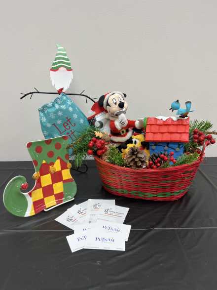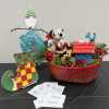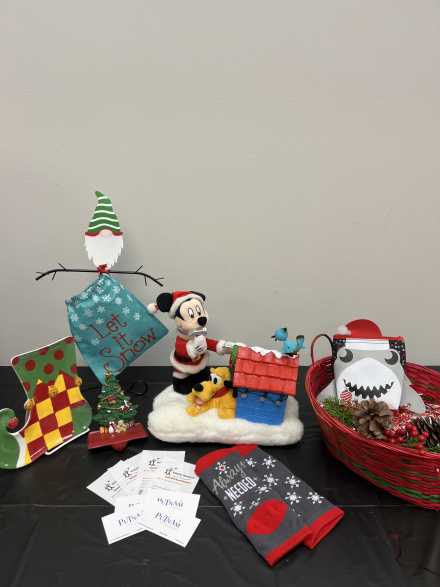 Mickey Mouse is building a home for Pluto in this classic Disney Holiday piece. Also includes four passes to Putnam Museum and Science Center, Davenport, Iowa, four passes to Family Museum of Arts & Sciences, Bettendorf, Iowa, "Let it snow" drawstring bag, Christmas gnome-themed jewelry tree stand, Thirty-one holiday koozie/pouch, elf candy tray, warm socks, Christmas tree stocking hanger, and moose ornament, all in red and green wicker basket.