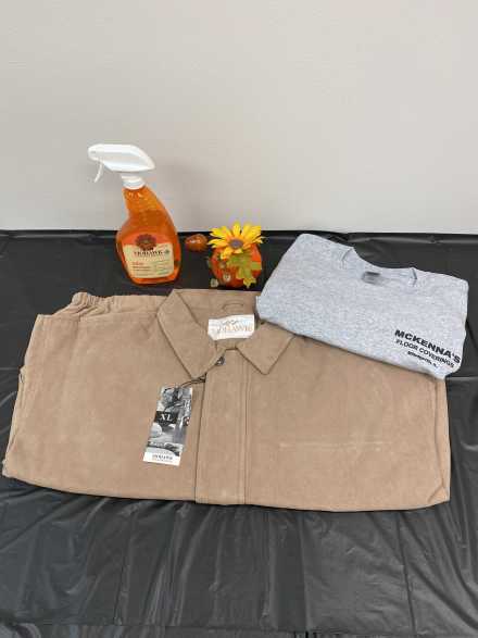 Putting in new flooring for the holidays? This $200 gift certificate from McKenna's Floor Coverings, Milledgeville, will get you started! Also includes size XL men's tan suede zippered jacket, size L gray t-shirt, Mohawk odor eliminator and fabric refresher, and mini pumpkin, all in metal basket.