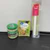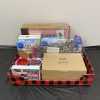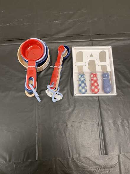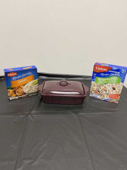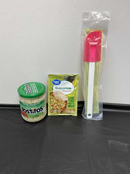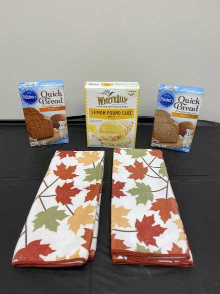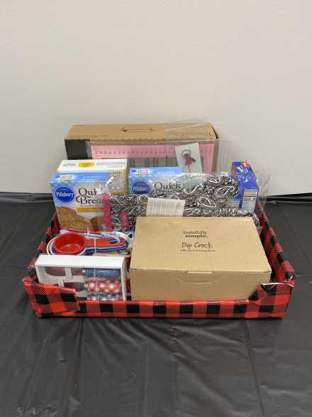 Nibble and nosh the time away with friends, enjoying various breads, cakes and dips. Includes Pampered Chef stoneware loaf pan, pink ribbon cake tester, pink spatula, oven mitt and pink cutting mat, Tastefully Simple dip crock with lid, Dolly sets of three cheese spreaders, measuring cups and measuring spoons, lemon pound cake mix, banana and pumpkin quick bread, Lipton onion and vegetable dip mixes, Tostitos creamy spinach dip, and guacamole seasoning mix, and kitchen towel.