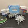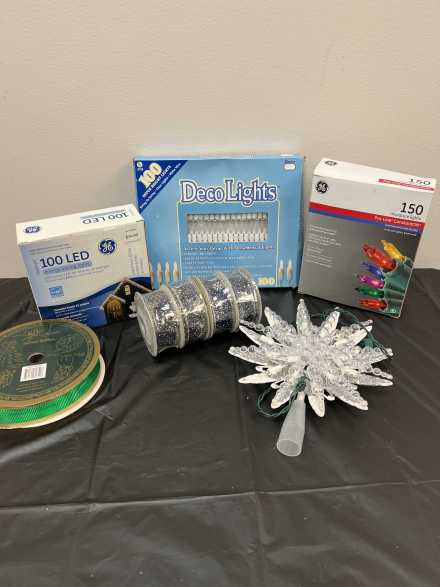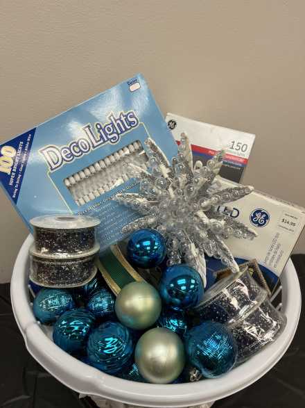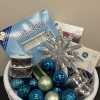 Plus, 50 yards of 1.5-inch wide wired green and gold ribbon, four rolls of Lillian Vernon blue and white snowflake-themed ribbon, each 10 yards X 1.25-inch wide, clear lighted snowflake tree topper, various shades of blue tree ornaments, three bags of frosty decorative snow, and soft snow sheeting, 36-inch X 8 feet, all in a white laundry basket and red and white snowflake box.