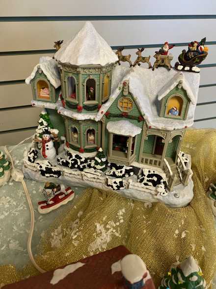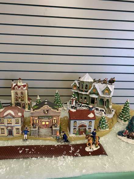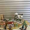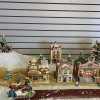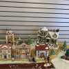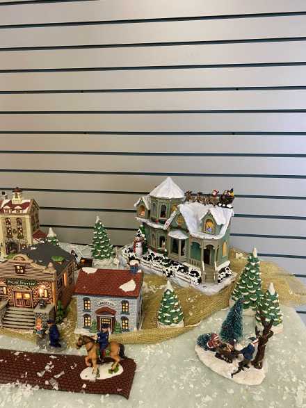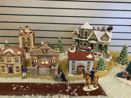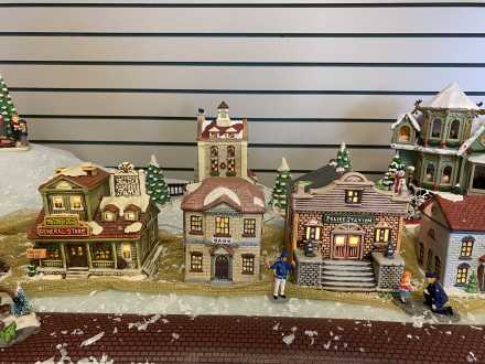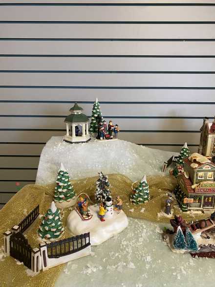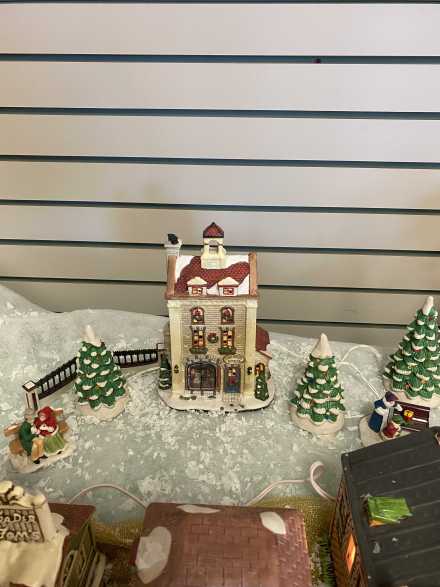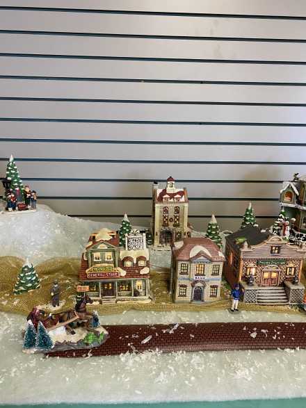 Create a picturesque Christmas village scene from days gone by during the holidays with this variety of porcelain collectibles, miniature people, lights and decorations! Includes American Porcelain Collectible Bank and Law Office, Colonial Village Police Station and General Store, Victorian Christmas Church's School, 10-piece Village Collectable Porcelain Lighted Village Trees, Alpine Village Collection Village Gazebo, set of five iron gates and walls, two-story old-fashioned home decked out for Christmas, Lemax Village Collection Frolic in the Snow. Various townspeople, police officers, sledders, horse-drawn sleigh with riders, and carolers are also included in the scene. Includes large plastic tote for storage.