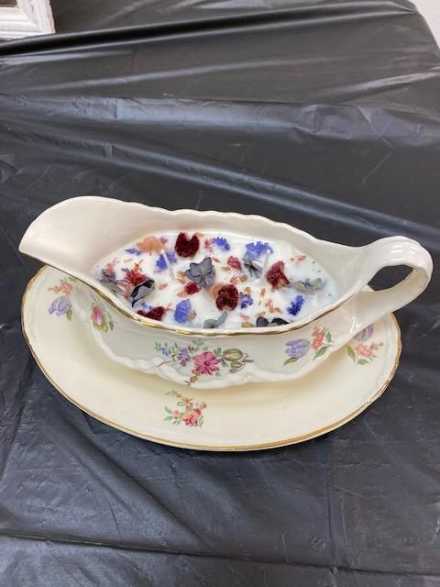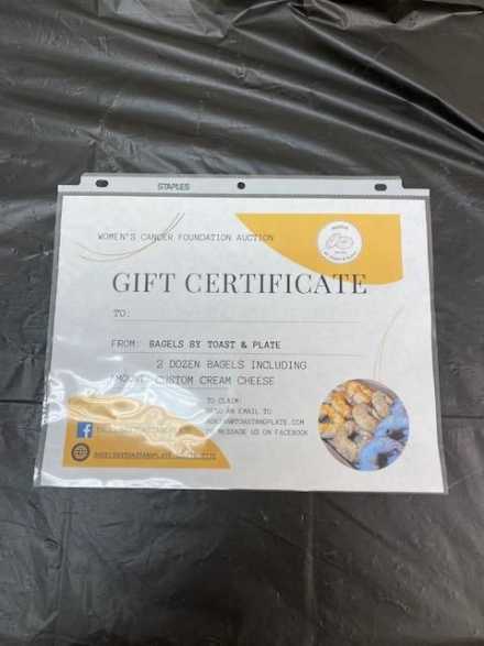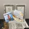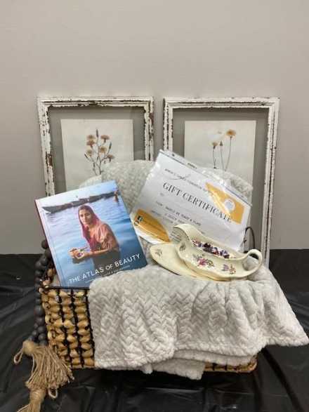 Vibrant hues of dried flowers adorn this hand-poured soy-based candle in a vintage gravy boat with saucer, making it one-of-a-kind! Also includes two 14 X 20-inch framed prints of wild plants, 60 X 70-inch Rachel Roy gray textured throw, "The Atlas of Beauty" book, gift certificate for 2 dozen bagels with cream cheese from Bagels by Toast and Plate in Sterling Farmer's Market, and decorative gray beads with tassles, all in large wicker basket with wire handles.