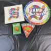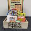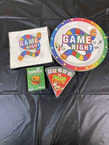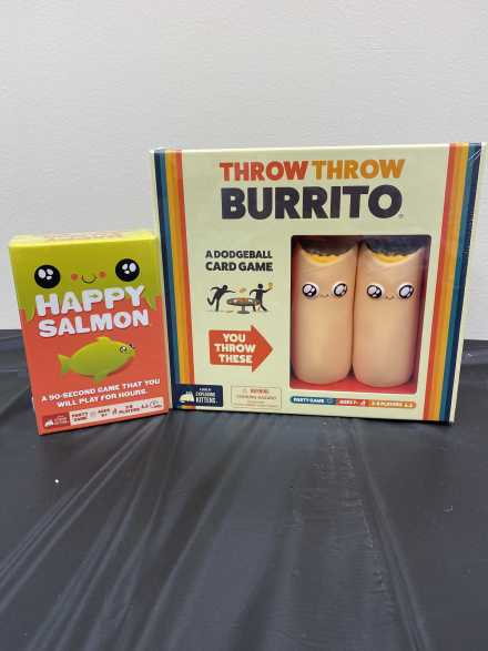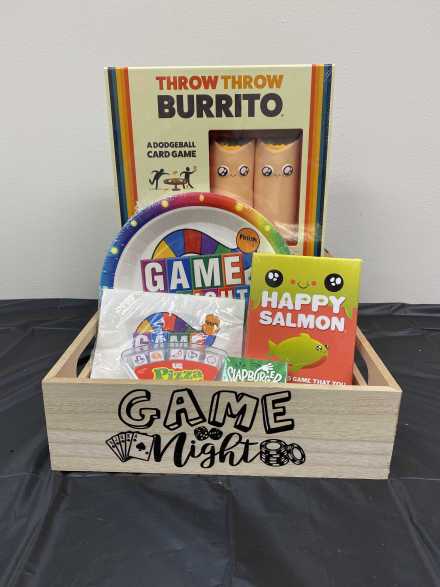 This delicious collection of fun family games has zero calories. Play as much as you want! Includes Throw Throw Burrito dodgeball card game, Happy Salmon card game, Game Night plates and napkins, Pizza Party dice game, and Slapburger card game, all in a "Game Night" wooden box.