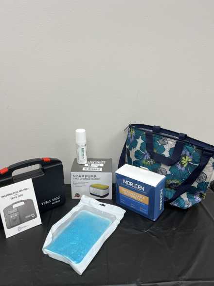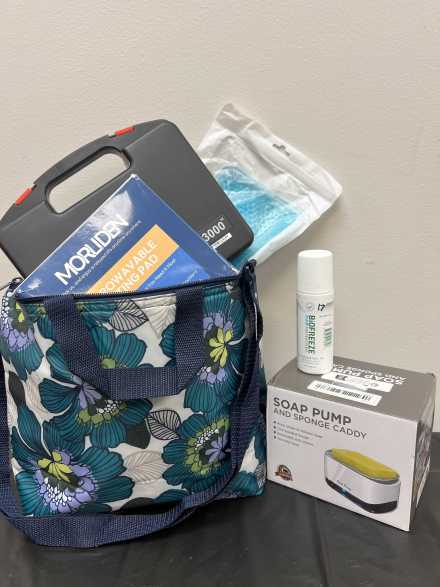 Get relief for those aches and pains with a Tens 3000 non-invasive electric impulse electrode set. Try a Morliden microwavable heating pad or 8 X 5 inch gel pack for extra comfort and wash hands with the Soap Pump and Sponge Caddy, all in a Thirty-one Garden party crossbody thermal tote.
