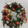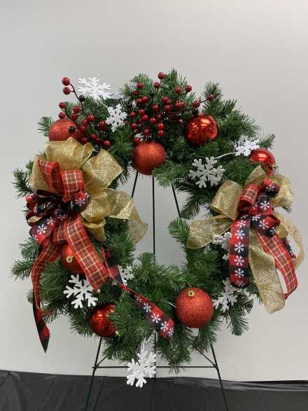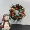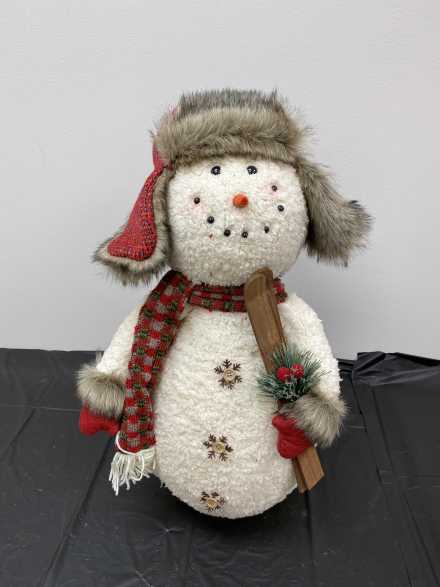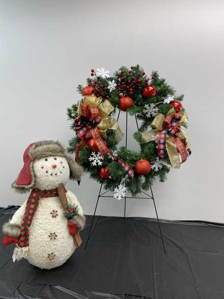 Gorgeous 24-inch diameter Christmas wreath festooned with red berries and baubles, glitzy gold, red and green plaid ribbon and an adorable, huggable stuffed 22-inch tall Snowman with knit fur-trimmed hat and skis.